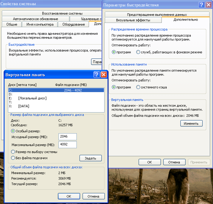 Одной из возможных проблем может быть то, что файл подкачки слишком мал. Одним из возможных решений может быть увеличение файла подкачки. В Windows XP делаем это так: правой кнопкой мыши кликаем на “мой компьютер”-> свойства-> дополнительно-> быстродействие-> параметры -> дополнительно-> виртуальная память>изменить. Вводите нужное значение и кнопку «задать». В других «Окнах» это ненамного сложнее. Кстати, иногда в некоторых играх, например Сталкере, требуется переустановка игры после увеличения файла подкачки, так как игра почему-то видит старый размер.